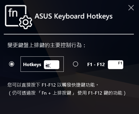 平常如果不太使用上方 F1~F12 按鍵,阿湯會推薦用 ASUS Keyborad Hotkeys 設定為 Hotkeys,這樣一來就不需要按住 Fn 鍵搭配,直接按功能鍵就能使用,平常也能透過 Fn + Esc 來快速切換。