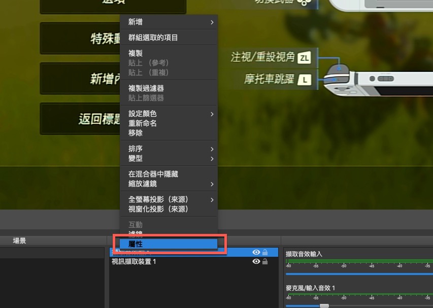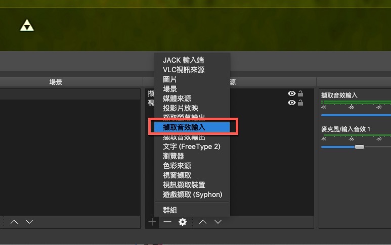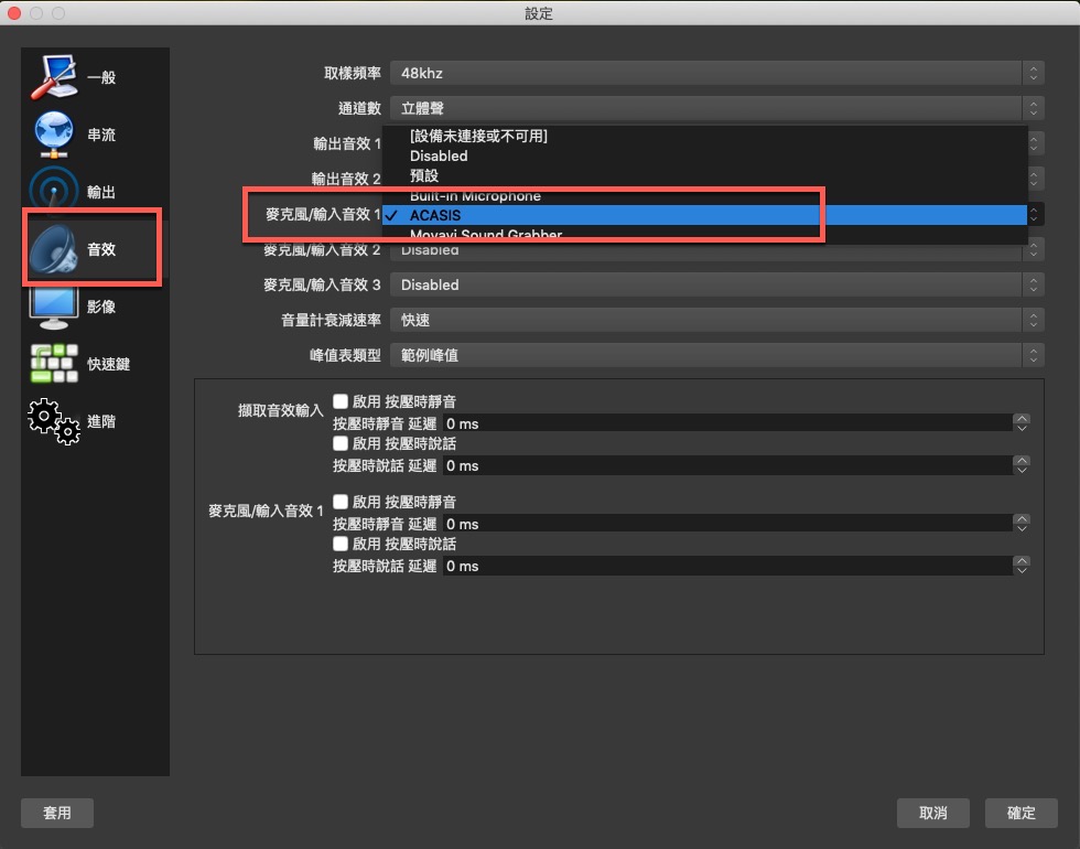如果上述音效設定後沒動靜,可以試試進入到 OBS 的設定頁面,在音效裡,找到麥克風/輸入音效 1,在這邊同樣選擇你的擷取器名稱,再去試試看。