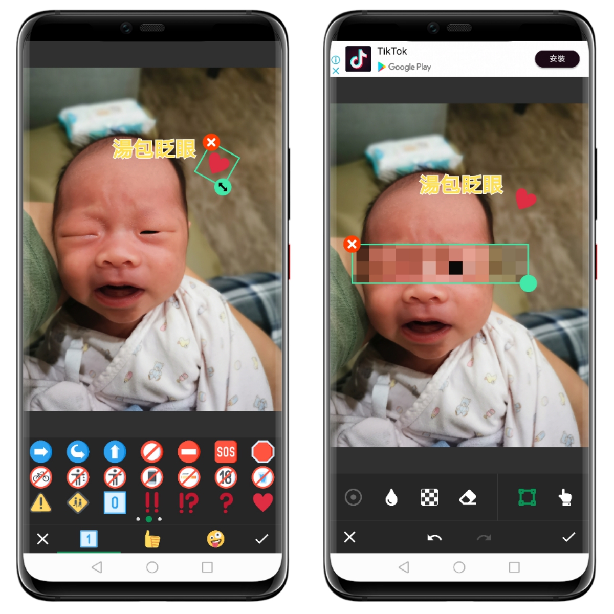 貼紙的部份提供一些簡易的表情符號、圖示等可以使用,馬賽克阿湯就不多解釋了,你懂。