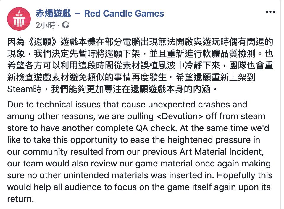因為《還願》遊戲本體在部分電腦出現無法開啟與遊玩時偶有閃退的現象,我們決定先暫時將還願下架,並且重新進行軟體品質檢測。也希望各方可以利用這段時間從素材誤植風波中冷靜下來,團隊也會重新檢查遊戲素材避免類似的事情再度發生。希望還願重新上架到Steam時,我們能夠更加專注在還願遊戲本身的內涵。