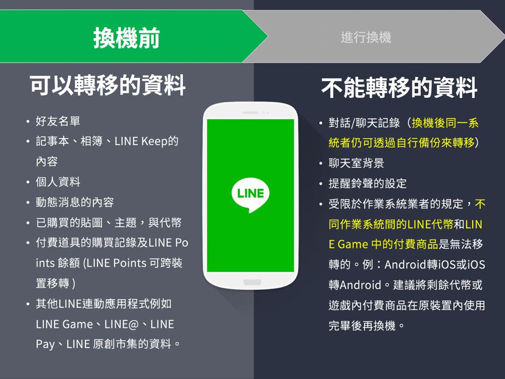 - LINE Coins (LINE 代幣) 與聊天記錄無法跨系統轉移。