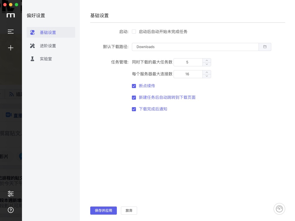 在設置中,可以先設好預設的下載路徑、最大任務數量以及每個載點的最大連接數,而且 Motrix 支援斷線續傳的功能,即便你下載到一半突然斷線也不用擔心要重來,如果在咖啡廳上網上到一半要先回家再繼續也可以。