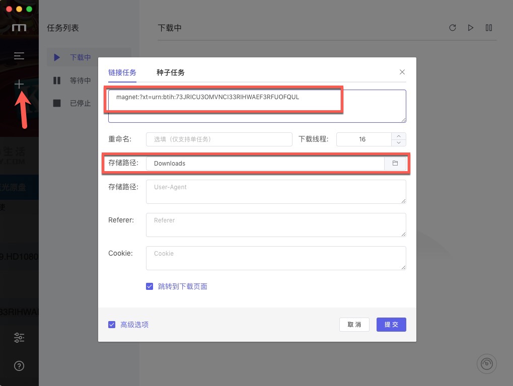首先是連結類型的下載點,直接點擊左邊的「+」後,就可以貼上磁力、百度雲盤等連結,然後選擇儲存路徑就可以開始下載。