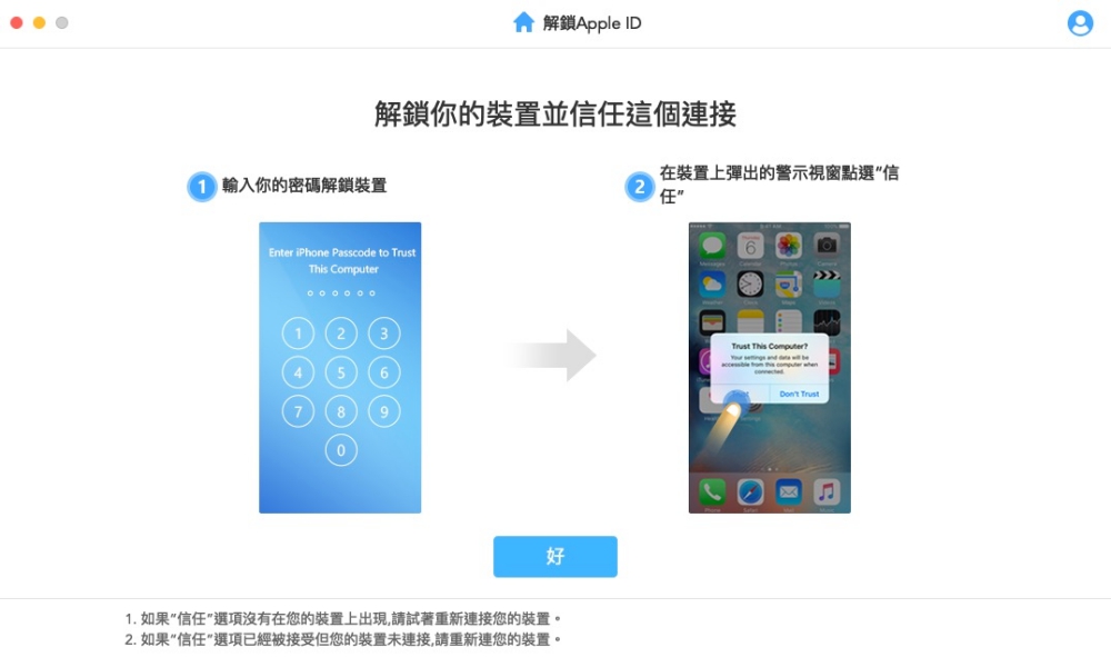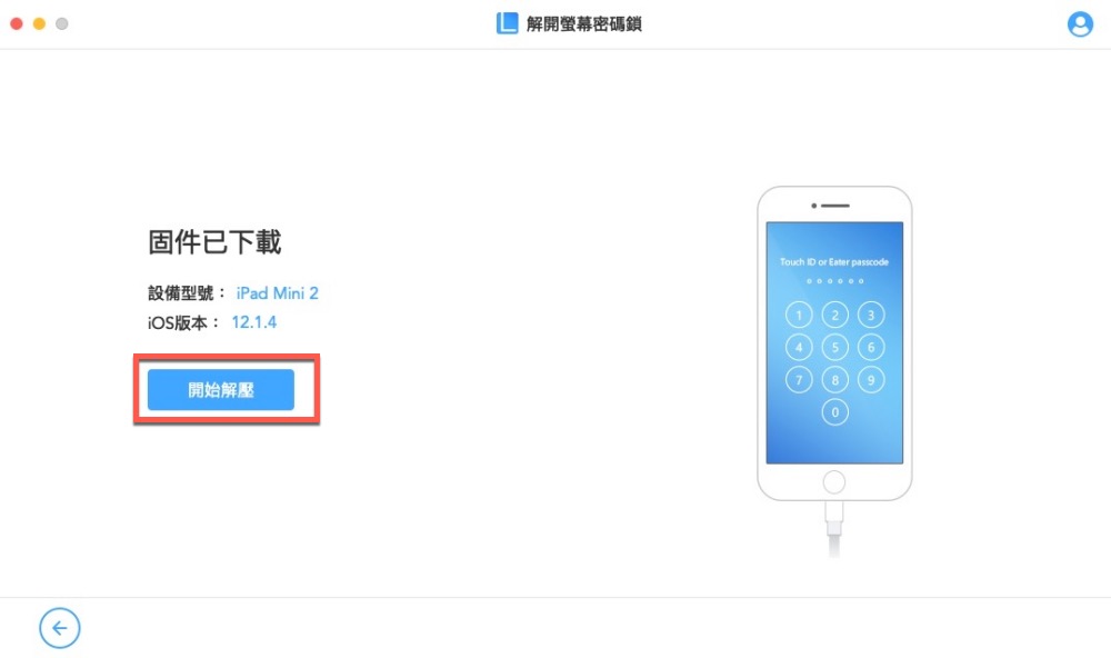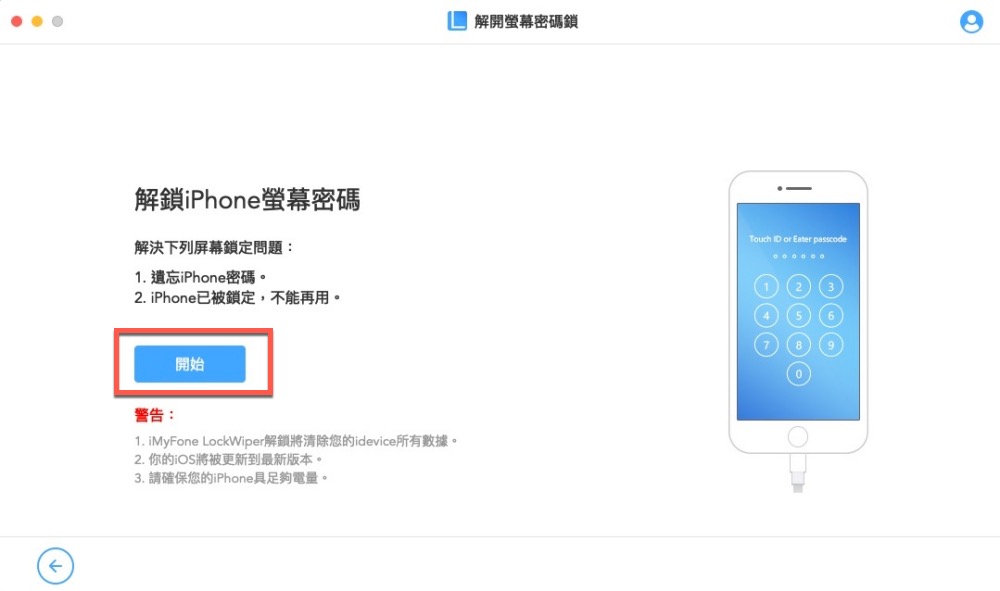 將你的 iPhone 或 iPad 接上電腦後,開啟軟體,選擇解開螢幕密碼鎖後按下開始。