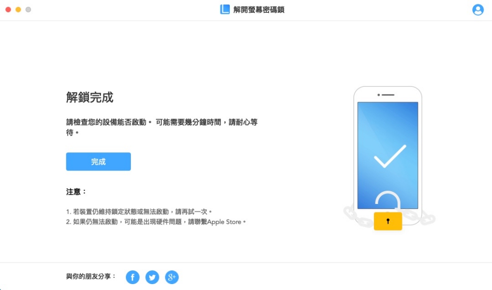 這軟體支援 Windows、macOS 雙系統,執行後就只有二個功能,分別是「解鎖 Apple ID」以及「解開螢幕密碼鎖」,我們先以最常見的螢幕密碼鎖來做為範例。