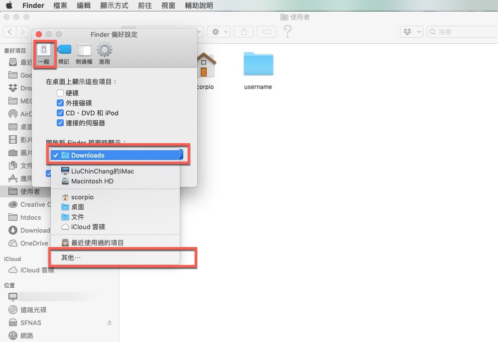 在一般裡就可以看到下方的「開啟新 Finder 視窗時顯示」,這邊就可以變更預設資料夾了,如果預設顯示的幾個都不是的話,可以點「其他...」,就可以自訂任一個資料夾了。