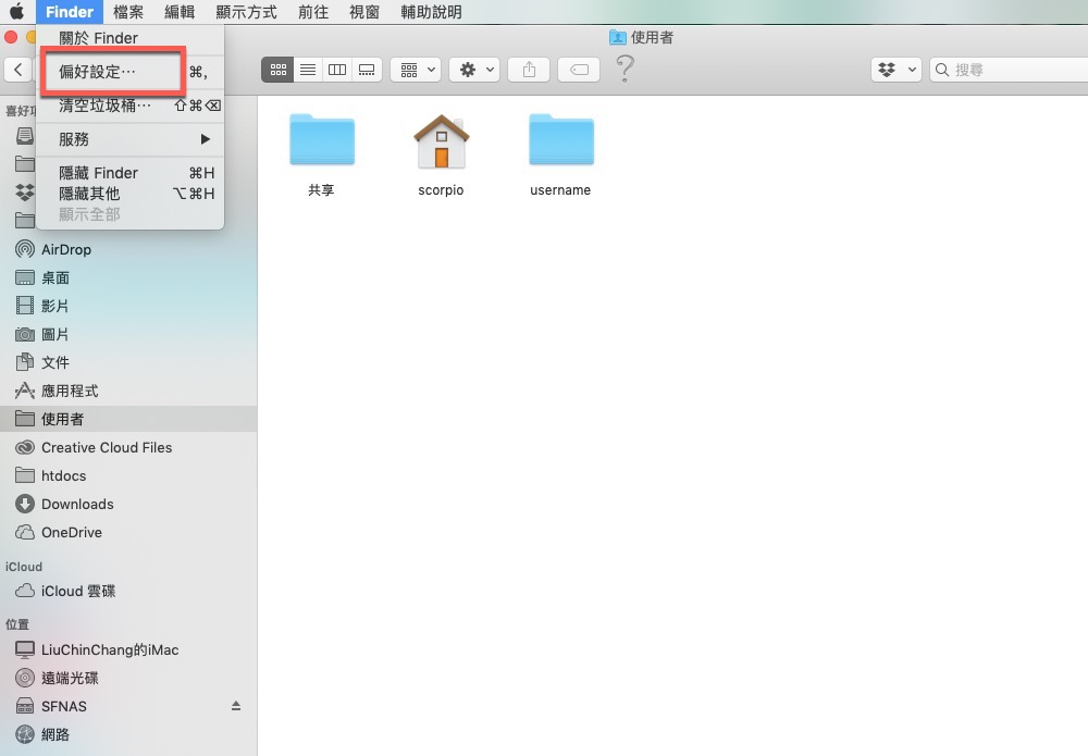 首先點擊左上角的 Finder,進入「偏好設定」。