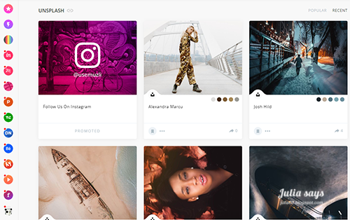 我會再次注意到 Muzli 得說一說最近聚合到此的新朋友 Unsplash,主動跟很多媒體結盟,發展多元,到哪都看得到它。其實 Unsplah 有自己的[擴充套件],打開新分頁就有隨機美圖可看,但來 Muzli 可以看到 Unsplash 最新圖輯,一次可以看到豐富又多樣的照片,偶爾可以挑幾張當封面素材;就算不下載,逛一逛看看人家怎麼拍,激發創意和靈感也不錯。