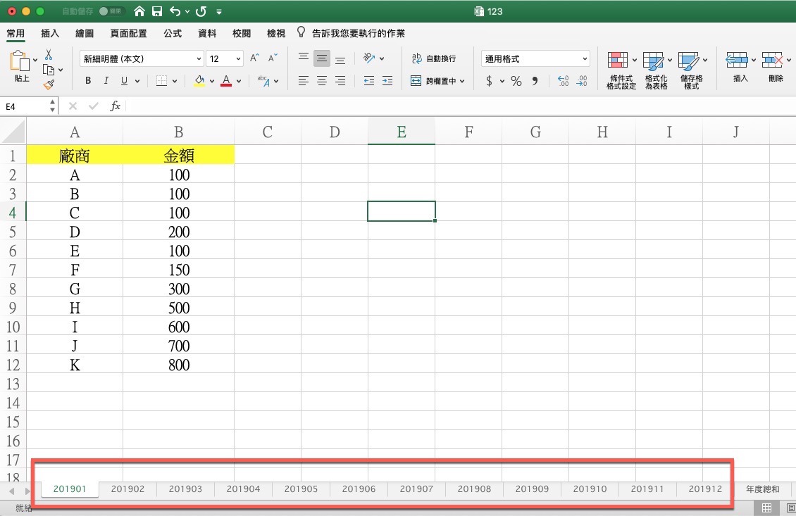 大家仔細看一下下方的工作表,分別有 1~12 月份,每個月份的欄位都是一樣 A 到 K 廠商,我們要做的是在最後一個工作表進行加總 A 到 K 廠商的年度總和。