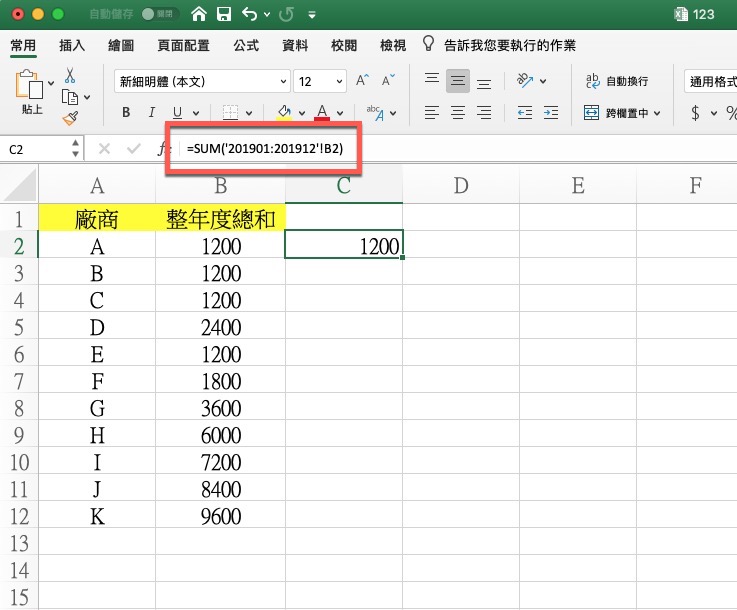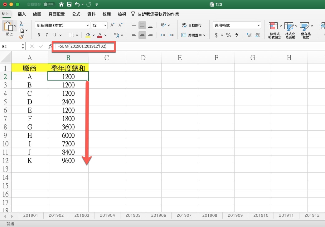 之後,就可以按一下第一個工作表 201901,然後按住 Shift 後再點擊最後一個 201912,這樣就會看到公式變為