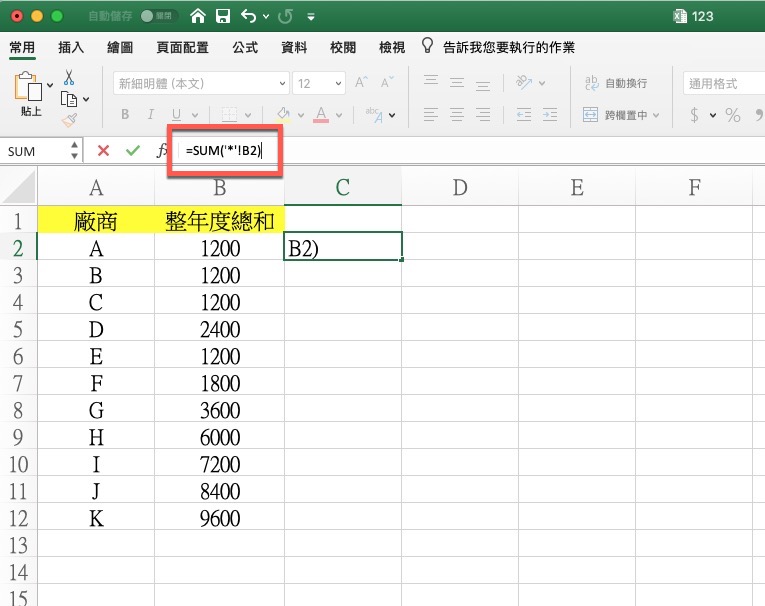 我們可以這樣輸入公式:=SUM('*'!B2)