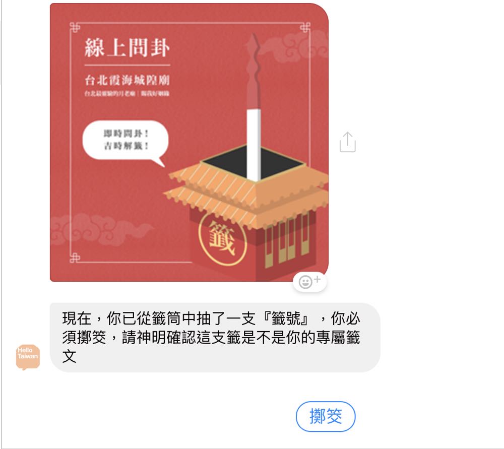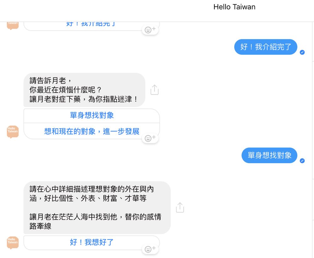 只要點進 Hello Taiwan Facebook 粉絲頁面,在私訊中打上「Hello」或是「開始使用」,Chatbot 就會出現幫自己求姻緣、幫好友求姻緣與幫家人求姻緣三個選項,只要點選想要求的對象,便會請你開始介紹自己、問你是單身想要求對象還是想要跟現在對象進一步發展、許願想要的對象條件等,當一切就緒後就能開始求籤。