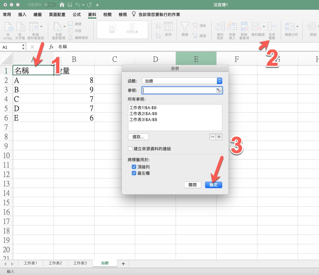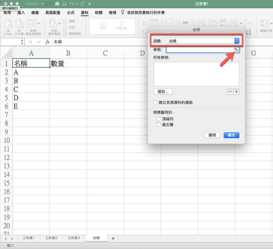 首先在加總的那個工作表先打好最上方的標題,比如名稱跟數量,然後按一下名稱的位置,選擇上方的資料,再選擇我們這次要使用的功能叫做「合併彙算」。