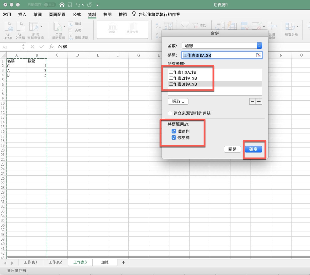 依序將要加總的工作表加入後,將頂端列跟最左欄勾選起來,按下確定。