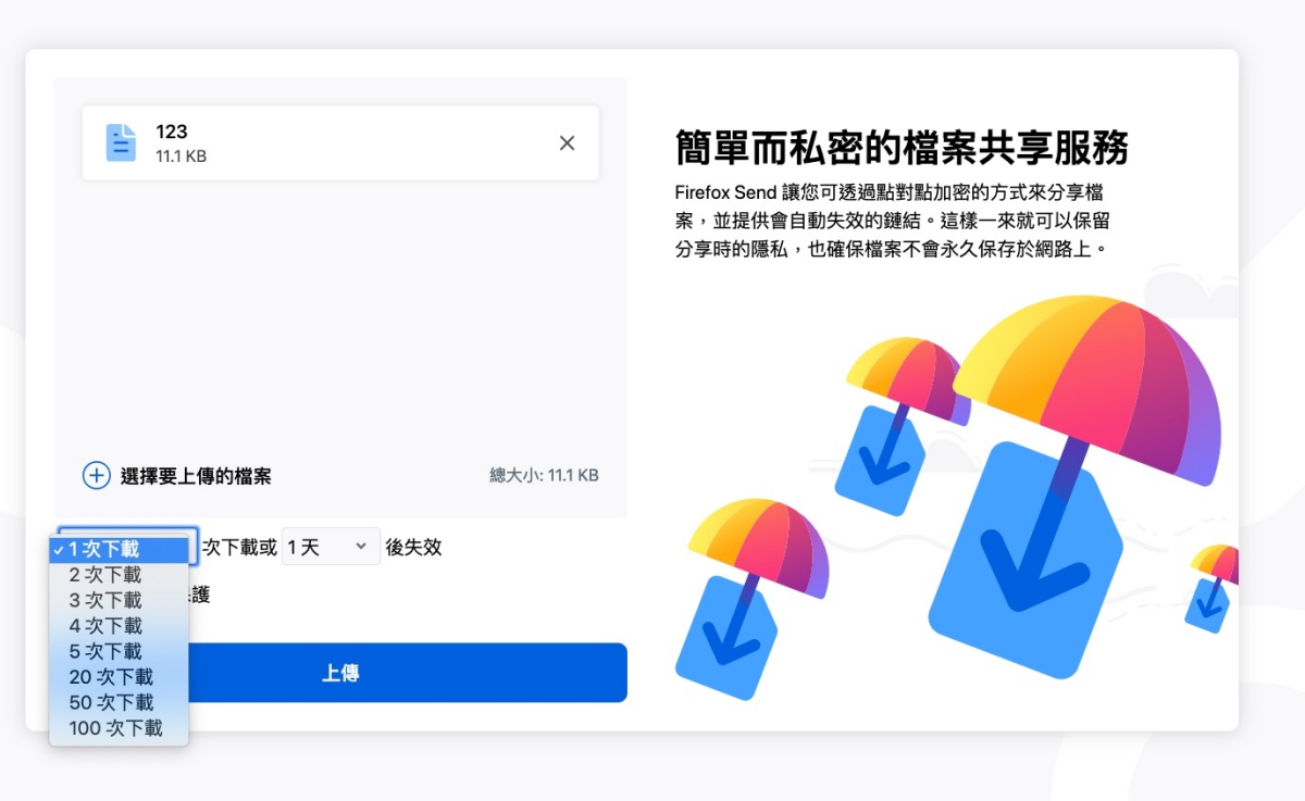 阿湯平常分享檔案給朋友都會用 Google Drive 或者從自己家裡的 NAS 直接分享,但缺點是每次分享完總會忘記關閉權限,因為不知道朋友什麼時候會下載完畢,要是連結一不小心外漏的話就等於算是半公開了,所以阿湯今天來分享一個新的檔案分享服務叫做 Firefox Send,顧名思義就是由 Firefox 這知名瀏覽器同一家公司所開發提供的,不需註冊的情況下就能上傳 1GB 的檔案,註冊登入使用則可以上傳最大 2.5GB 的檔案,登入後還能設定下載次數及時效天數,往下來看吧。