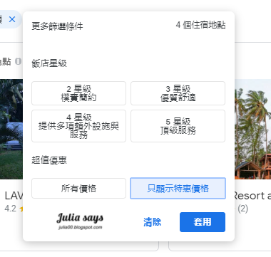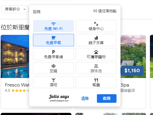 Google 的搜尋觸角現在伸到飯店這個項目了,用以下網址,進入搜尋主畫面,暫且不論美感了,可用中文鍵入目的地,日期選好,價格也用拉桿設定預算。底下是篩選條件可讓你縮小範圍,例如房客評分、設施與星級選項。我選有附免費早餐和免費 WiFi,以及超值優惠,一下從 90幾個點篩選只剩4個點。