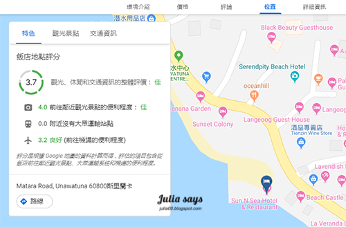 位置查詢善用 Google Map 功能,可以看得到這家飯店距離機場多遠,有無大眾運輸工具可搭,附近有什麼景點,是不是走路就到得了之類,不虧為 Google 地圖獨門絕招,應用到飯店與周邊定位真的好實用。