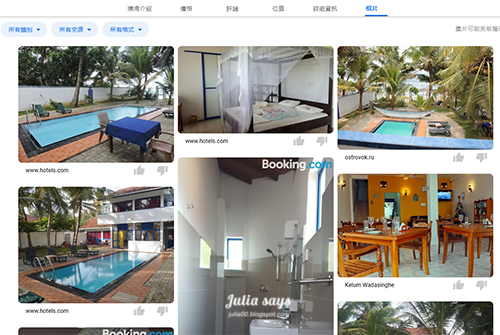 照片聚合各大網站與網友在 Google Map 投稿,也是能讓你看得更「清楚」的好方式,畢竟訂房網飯店貼的照片還無法讓你綜觀全貌,而入住過的房客拍的照片,或許會戳破沙龍照片燈光美氣氛佳假象,也有可能你看到更多更真實的樣貌,發現不住這飯店就可惜了。