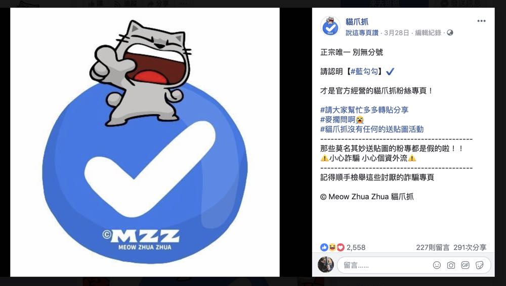 這幾天有些熱門貼圖免費下載的分享資訊,但受害的貼圖原創者如白爛貓/臭跩貓的原作「麻糬爸愛亂畫」、「貓爪抓」已經陸續在官方帳號上呼籲大家不要受騙,並且再次強調要有 FB「藍勾勾」認證的粉絲頁才是正版的粉絲專頁。而那些宣稱留言就能獲得免費貼圖的粉絲頁。其實會用聊天機器人引誘網友將活動分享到自己的塗鴉牆上,然後再讓網友的好友們誤以為真的是網友自己所分享,信以為真的繼續分享下去,進而造成病毒式的行銷。但其實目前分享的網友們
