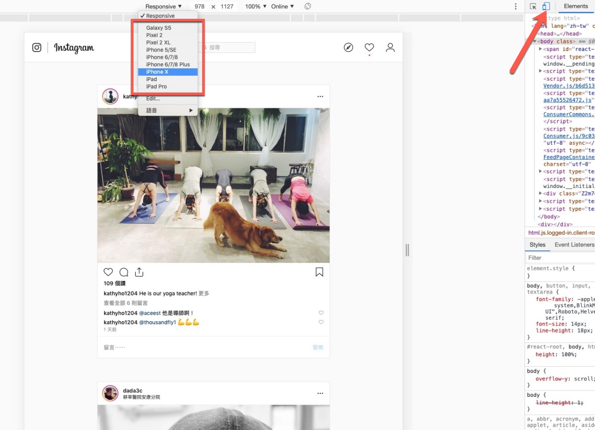 右邊或下方會出現一堆有的沒的,不管是出現在右或下方,請按一下紅色箭頭指的電腦手機圖示,確定他是變成藍色,這麼一來在上方就會有設備可以選擇,這邊列了很多手機型號,像是 Galaxy S5、Pixel 2 或 iPhone X 都可以,任選一個。