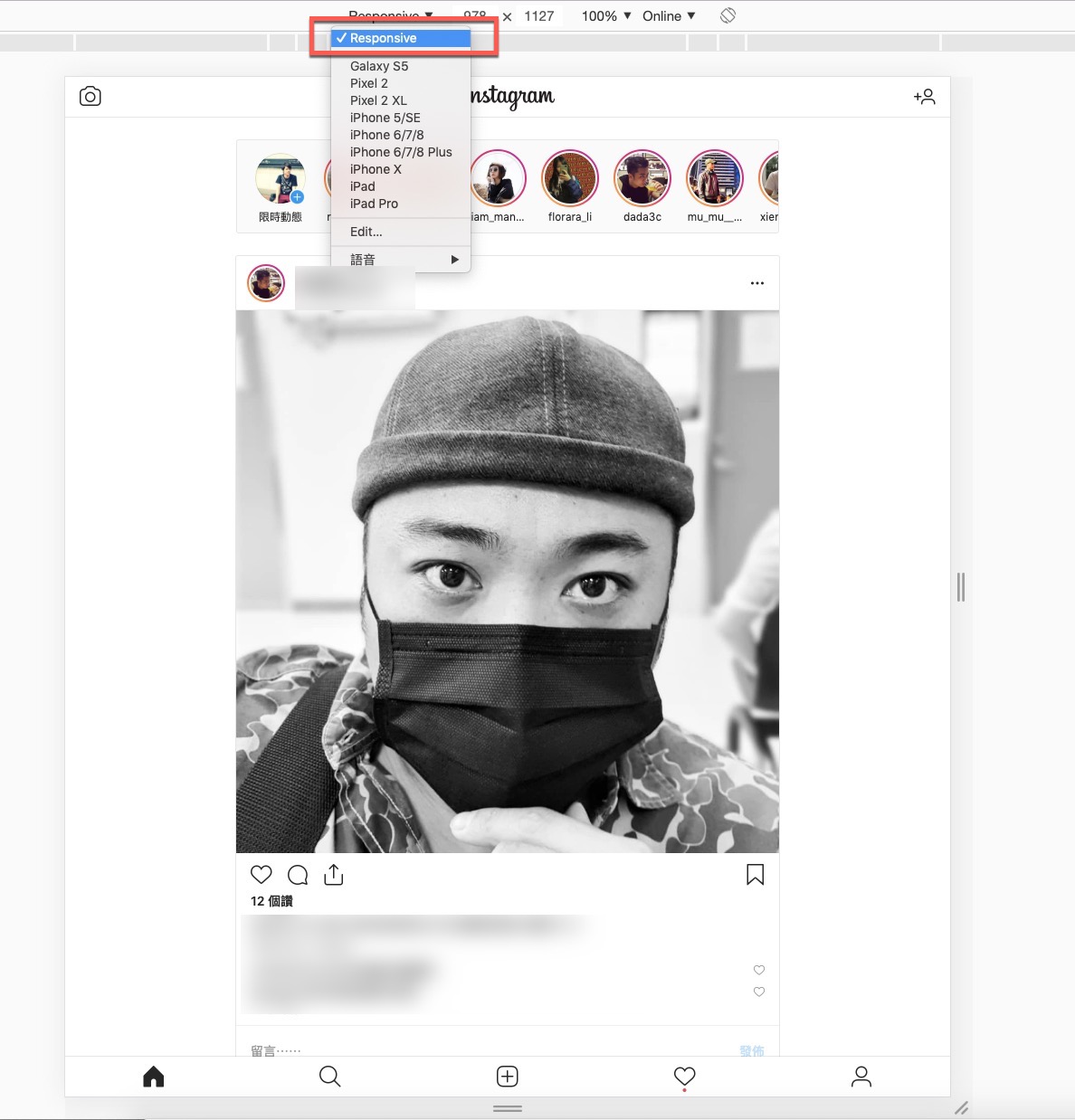 透過這樣方式就可以使用手機版畫面的 IG,像是濾鏡、基本編輯等都是有的,跟我一樣不愛用手機打字的就試看看吧。