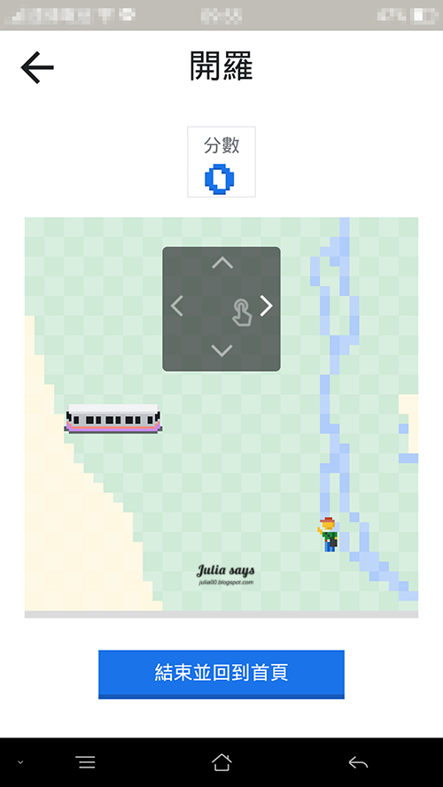 遊戲方式很簡單是沒錯,但是我手指不夠靈活,常還沒載到人,列車就撞牆了,分數始終無法突破個位數啊。