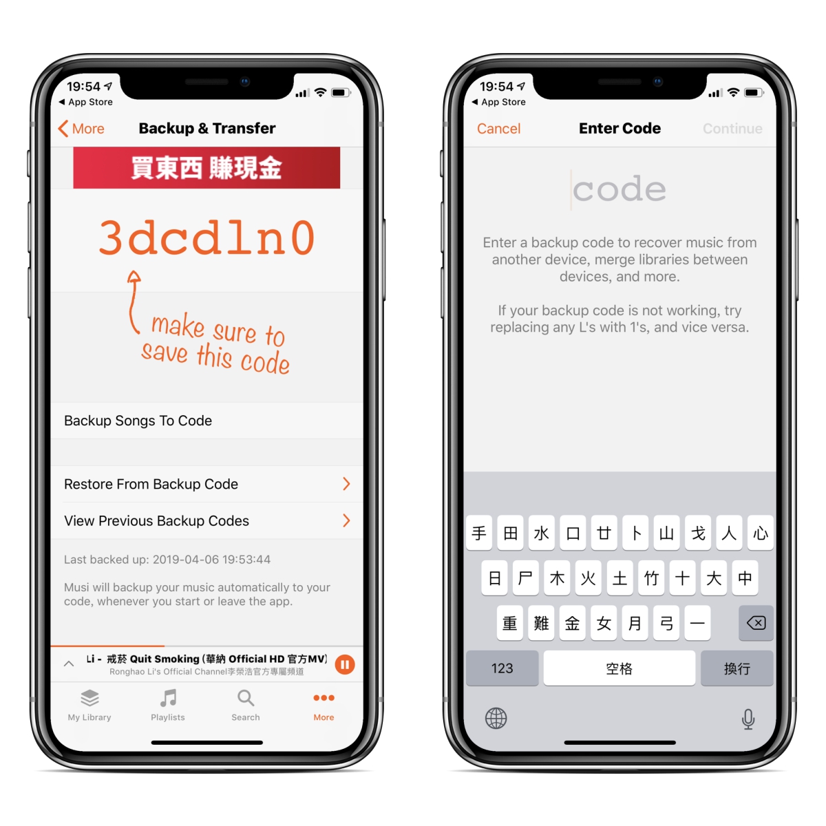 當你按下 Backup 備份時會提供你一組備份代碼,這樣你只要到另一支手機上點擊還原後輸入代碼,就會將收藏的音樂內容都移轉過去,超方便的。