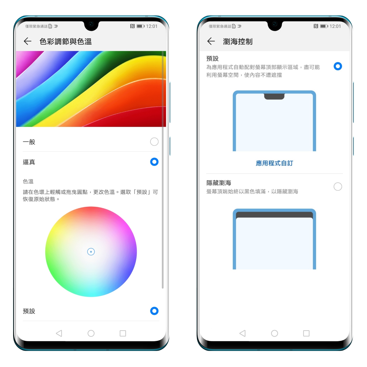 螢幕顯示可以依自己的喜好調整顯示色彩及色溫,瀏海控制也能依喜好的視覺來設定,若不喜歡一顆珍珠圓圈在上方,也可以使用整條黑色狀態列。