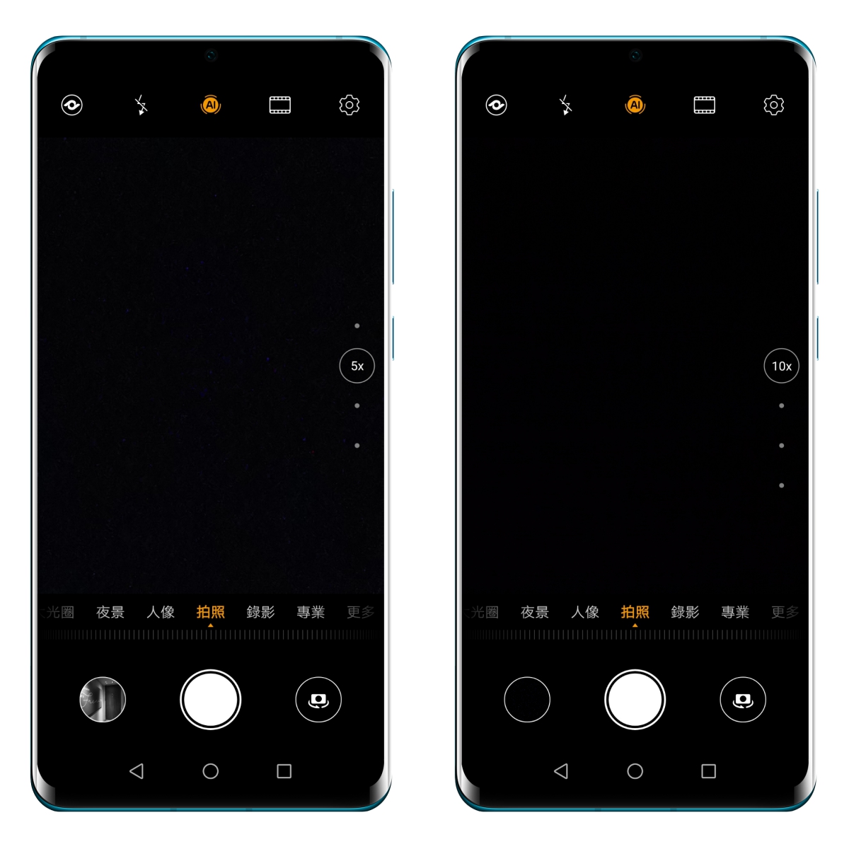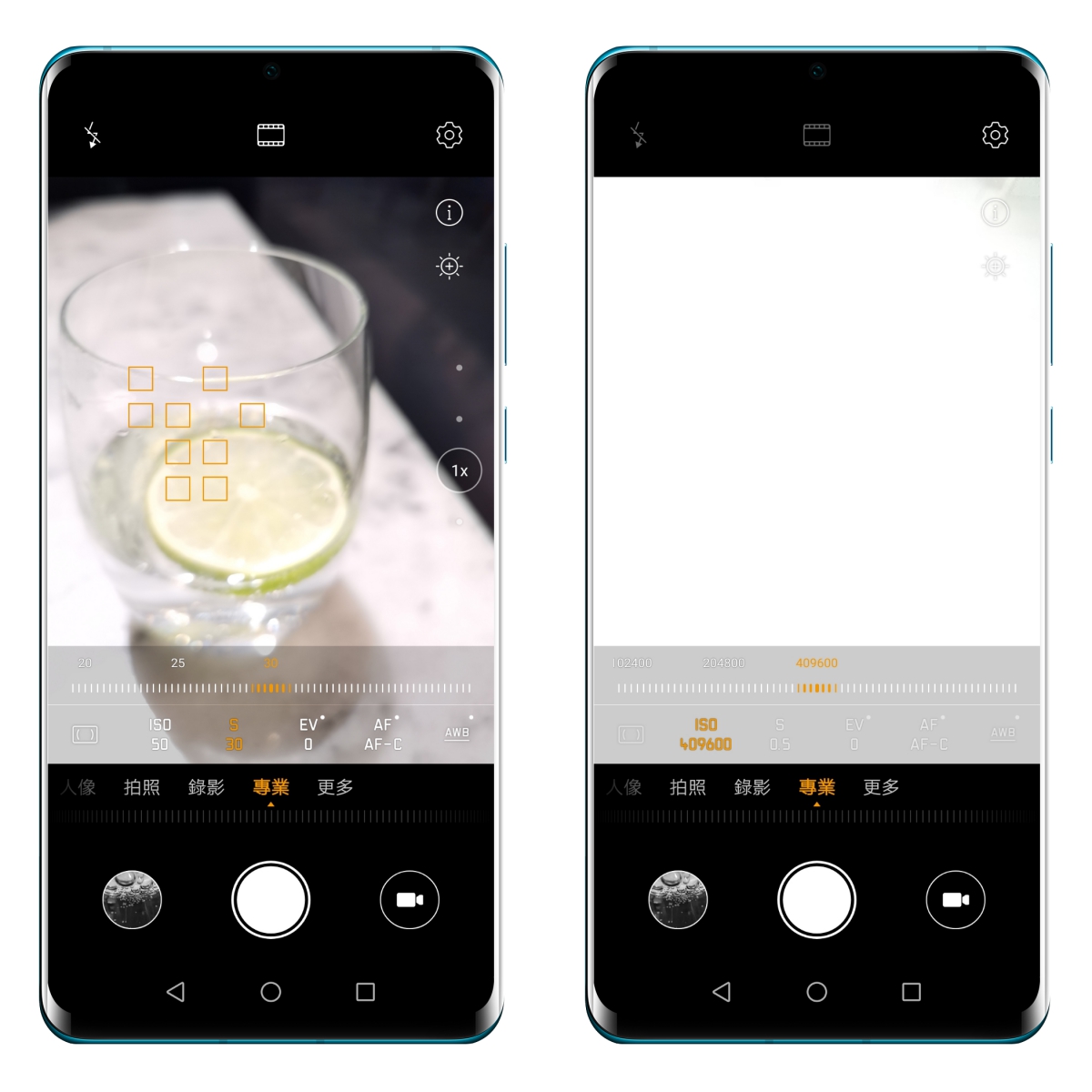 專業模式雖然不是人人都會去使用,但這是一個絕對不可或缺的功能,而 P30 Pro 這次切進專業模式後你會發現一個很酷的事,ISO 值居然可以達到 409,600,超過了 40 萬,雖然這樣的高感光值會讓噪點很高,但就跟單眼拍攝一樣,在黑暗的場景下,我們要的是「拍的到」不是畫質好,你看很多相機搭載的高感光設定,也是為了黑暗場景所使用的,手機能達到 40 萬真的很誇張。