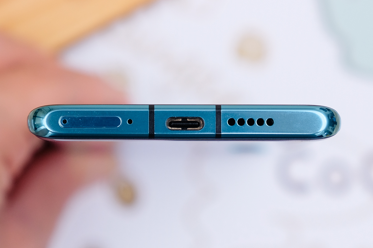 下方為 SIM 卡槽、降噪麥克風、USB Type-C 連接埠以及立體聲揚聲器。