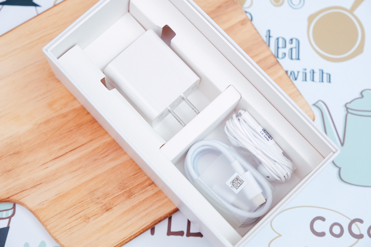 對了,盒裝裡除了 USB Type-C 耳機、充電傳輸線之外,最重要的是有一顆支援 SuperCharge 40W 高速充電的變壓器,手機只需很短很短的時間就可以充飽,即便是沒電趕著要出門,插上去充個十分鐘就可以讓你用很久,用過就有點回不去了。