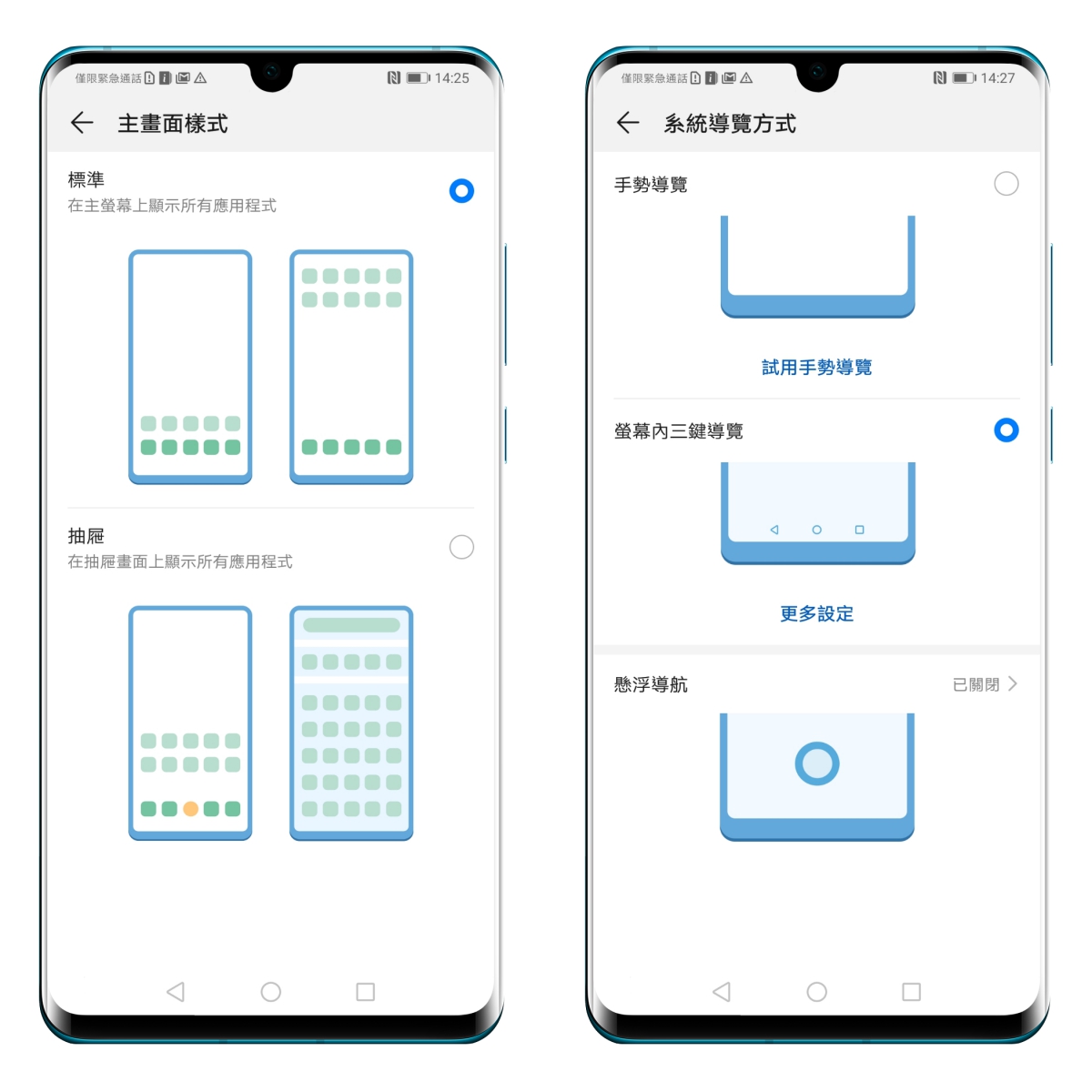 在這次搭載的 EMUI 9.1 中,將 Mate20 Pro 上頗受好評的「手勢導覽」持續沿用。可以在設定裡選擇,有別以往使用下方的導覽列操作,選用後下方的導覽列就會隱藏起來,全部改用手勢操作,用習慣的話會覺得很好用,操作起來更直覺,如果選擇手勢導覽,推薦主畫面樣式維持標準,用起來真的超順手。