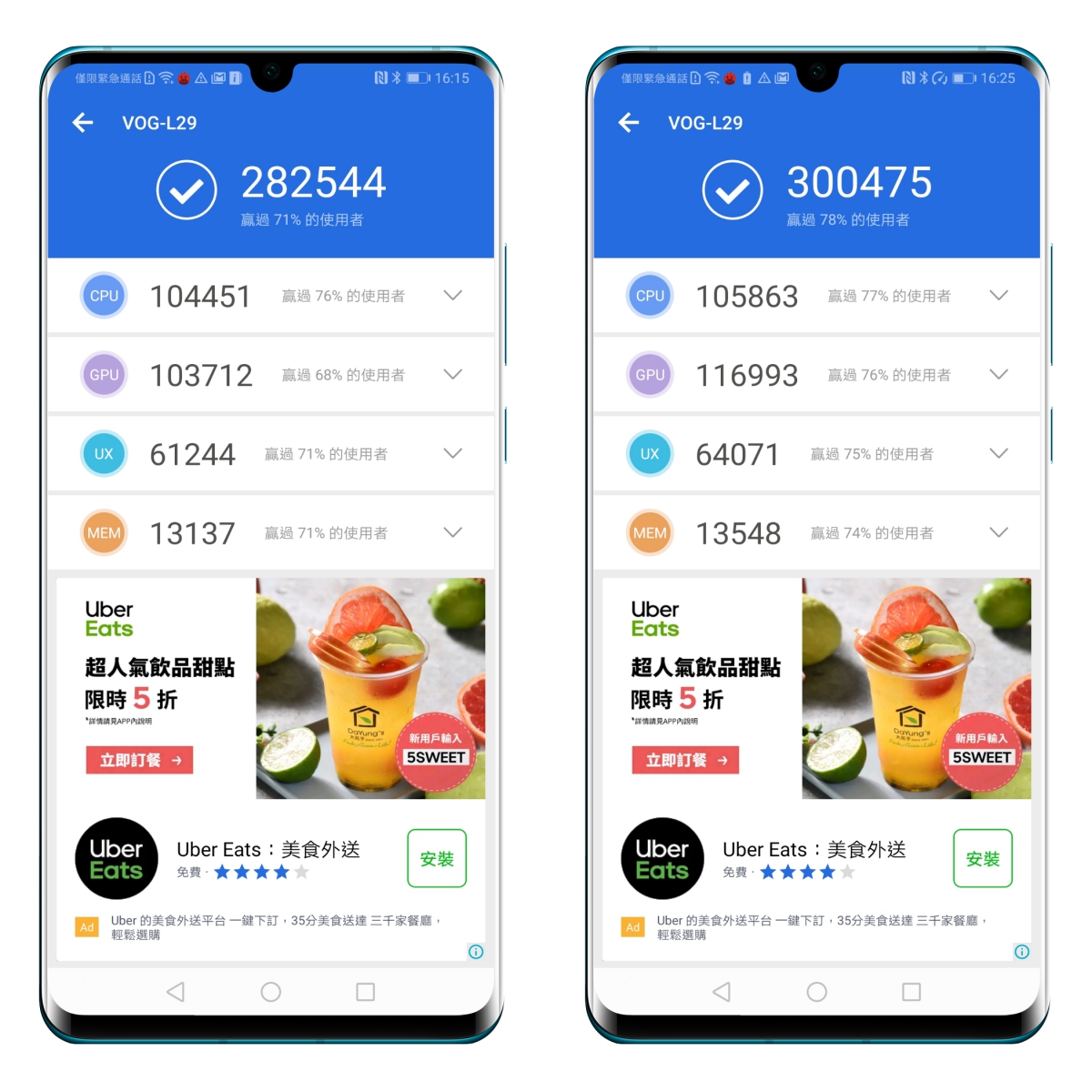 跑分的部份,由於本次 P30 系列均是搭載是 8GB 記憶體的頂規版本,因此我們直接看一般模式與效能模式的跑分。左邊 282,544 分是未開啟「效能模式」,右邊 300,475 則是開啟效能模式所測得的分數,雖然差這二萬算是差很多,不過實際使用起來,以 28 萬來說,市面上所有的遊戲應該只有順暢而已,應該不需要開到效能模式。