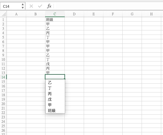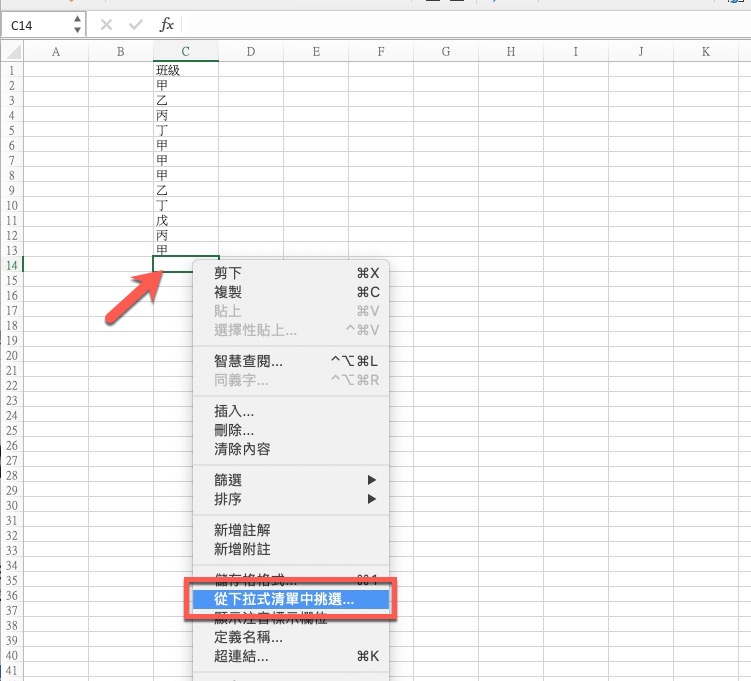假設像這樣,在班級的這一列資料,你會一直重複的輸入甲乙丙丁等內容,如果只有一個字那就算了,那如果一直重複輸入的內容有好幾個字?你應該是用複製貼上的方式來做。 其實只要在要輸入的那欄位右鍵「從下拉式清單挑選」。