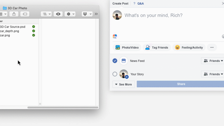 不過根據 Facebook 官方的介紹,桌機版上傳還是有點麻煩,必須先準備兩張 jpg 或 png 檔案格式的照片,然後一張是一般照片、另一張是有 "物品深度" 的照片(_depth 結尾檔案)然後上傳到 Facebook 後才能完成。