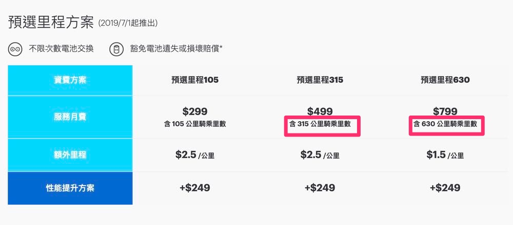 「預選里程方案」,收費方式也與「暢遊套裝」一樣維持 $299(預選里程 105) / $499 (預選里程 315)/ $799 (預選里程 630) 三種價位,但騎乘公里數卻較「暢遊套裝」中的暢遊 299 / 暢遊 499 / 暢遊 799 分別多了 5 公里 / 15 公里 / 30 公里,但卻也拿掉了定期回廠保養的服務。
