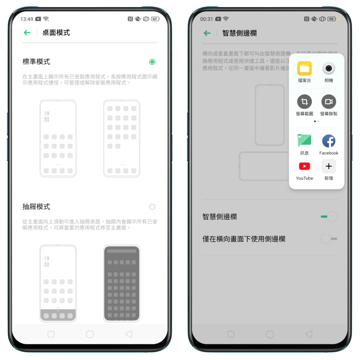 桌面的呈現及操作可以依習慣選擇,這次還增加了智慧側邊欄功能,可以在側邊的快捷欄中加入一些常用的功能,平常要使用只要從側邊滑開就可以直接啟用。