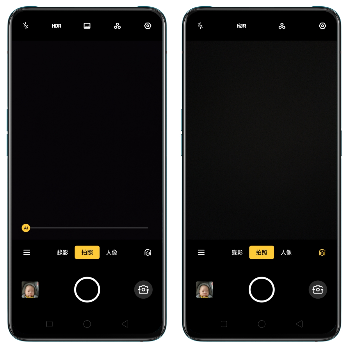 在 ColorOS 6.0 裡,相機介面變的更簡潔,主介面上的功能只有錄影、照相及人像,其他像是夜景、全景、專業、縮時攝影、慢動作等都是放在選單裡,操作起來更加方便。