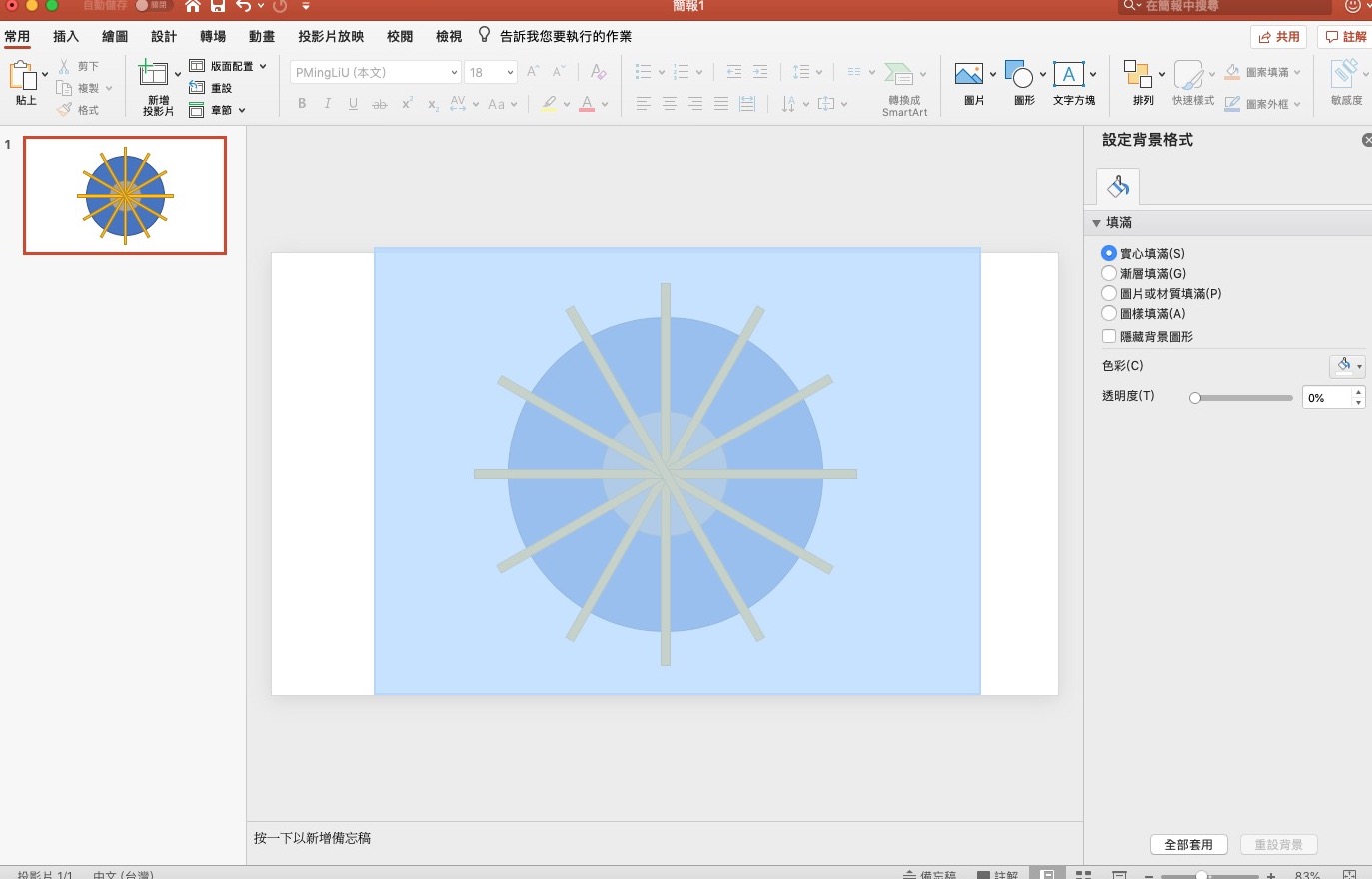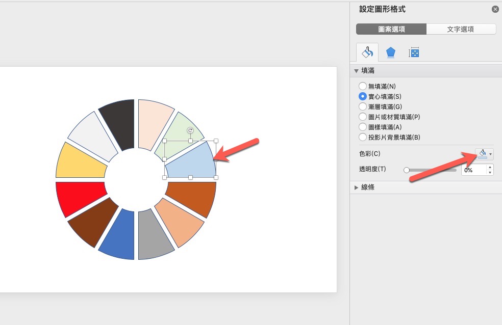 最後只要依需求再選擇每一個區塊變更色彩,就會變成不同顏色的分割扇形圓環,或者你想同一顏色也是可以啦。