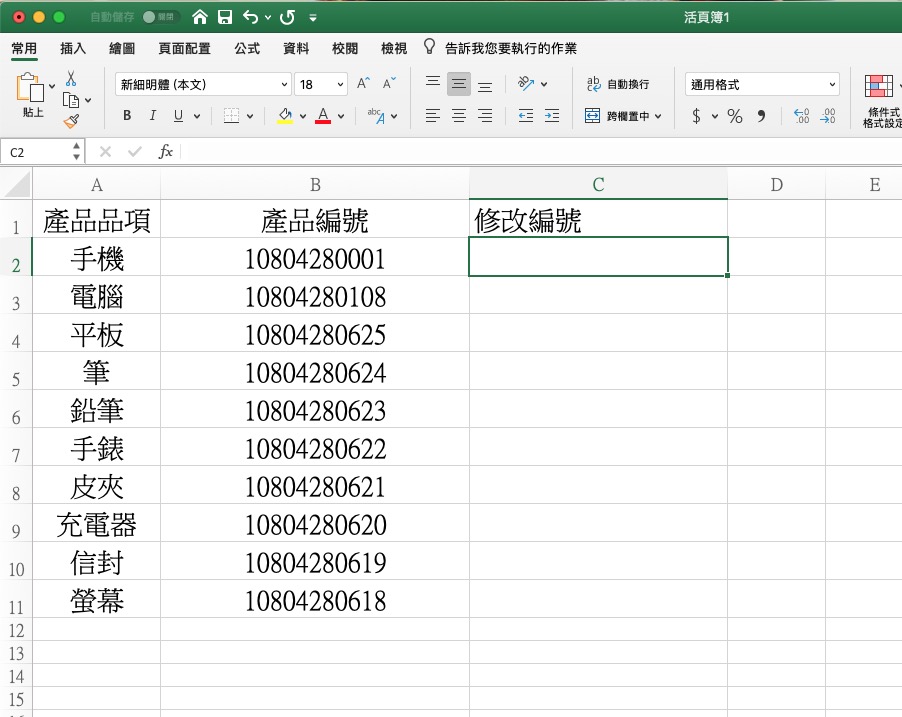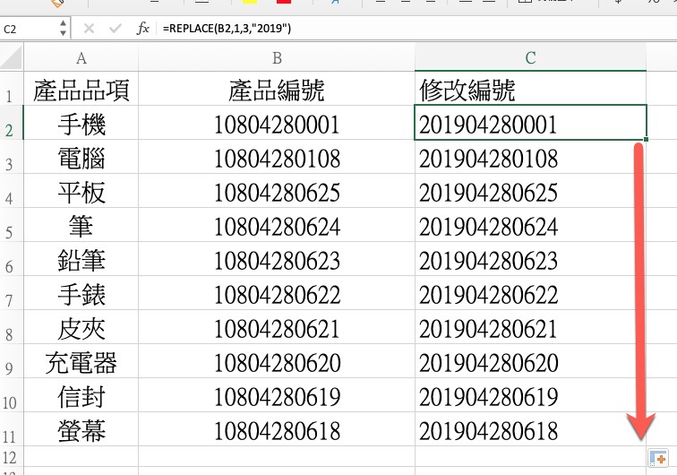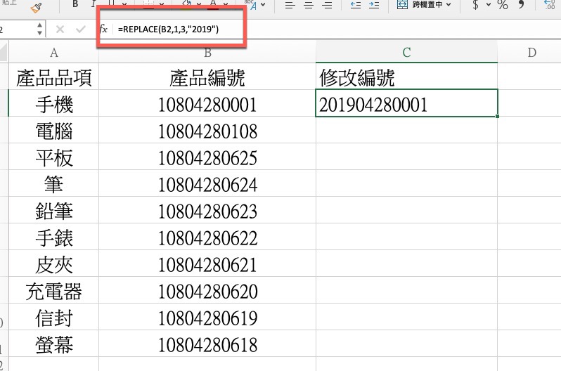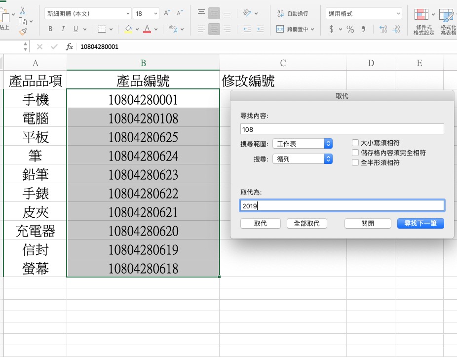 先來弄個最簡單的舉例,我們想要將產品編號中的 108 年開頭修改為 2019 的話要怎麼做?往下來看。
