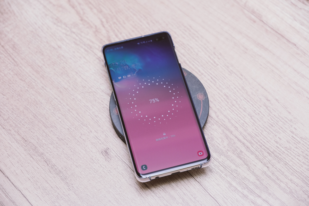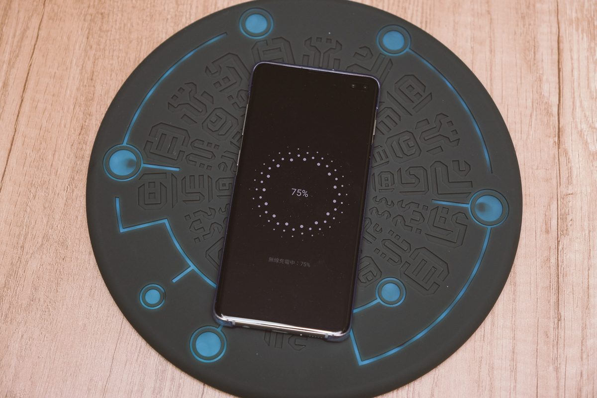 無線充電的瓦數是 10W,算中規中矩,不過這一塊真的非常大片,你看我中間放的是 Galaxy S10+,看比例就知道有多大片了,差不多是三支手機的寬度啊!