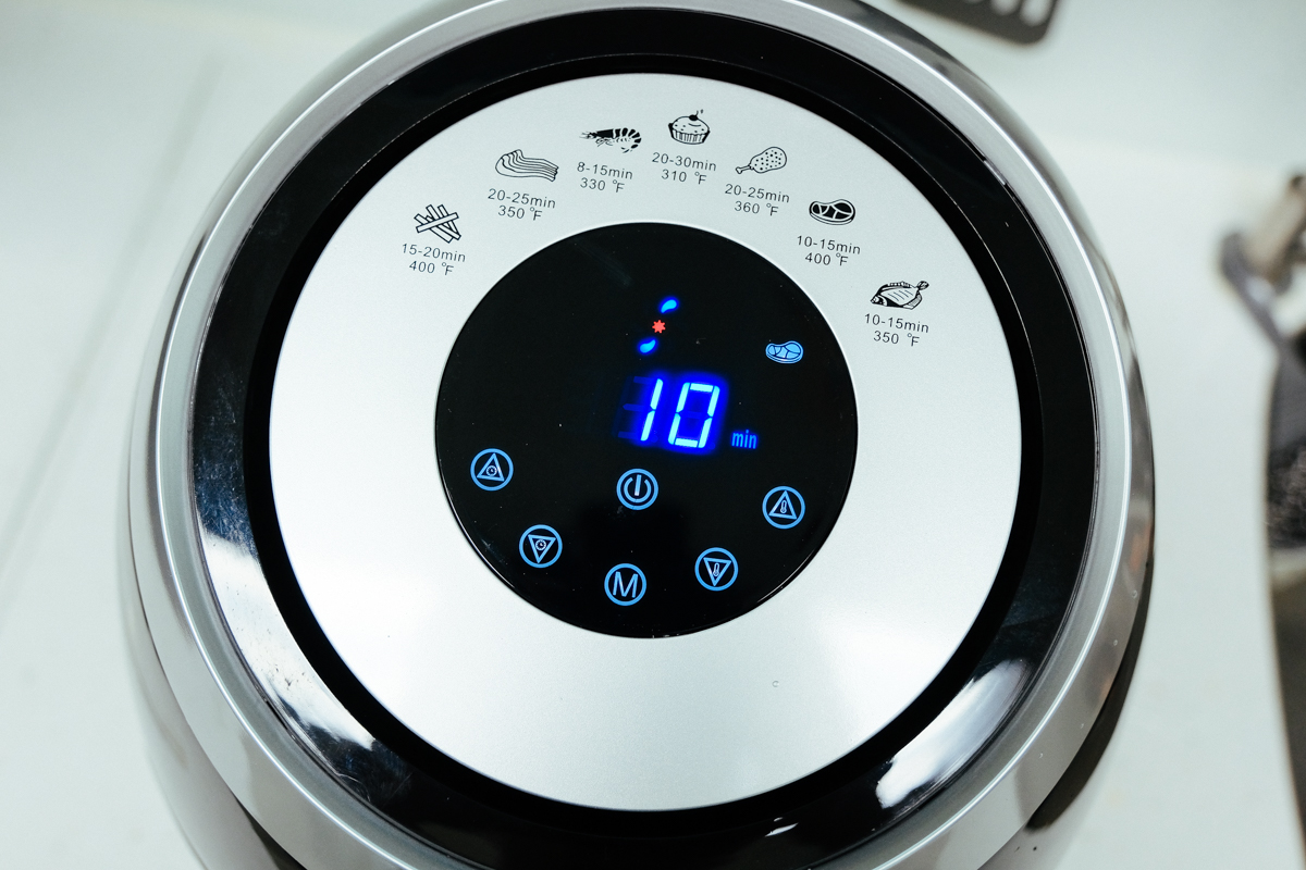 面板功能也很簡單易懂,按一下中間的電源開關,點 M 選擇內建模式直接開始料理,或者自行手動設定時間(左邊二個鍵)跟溫度(右邊二個鍵)。