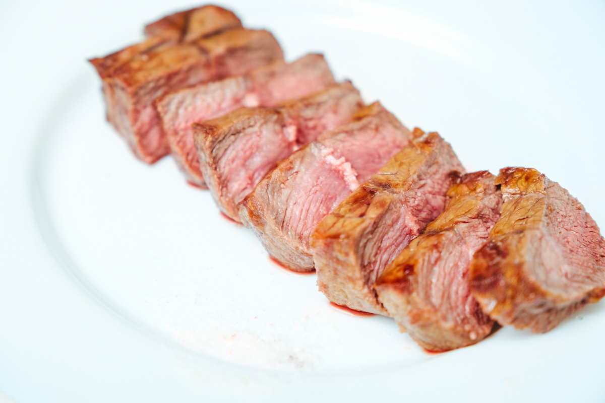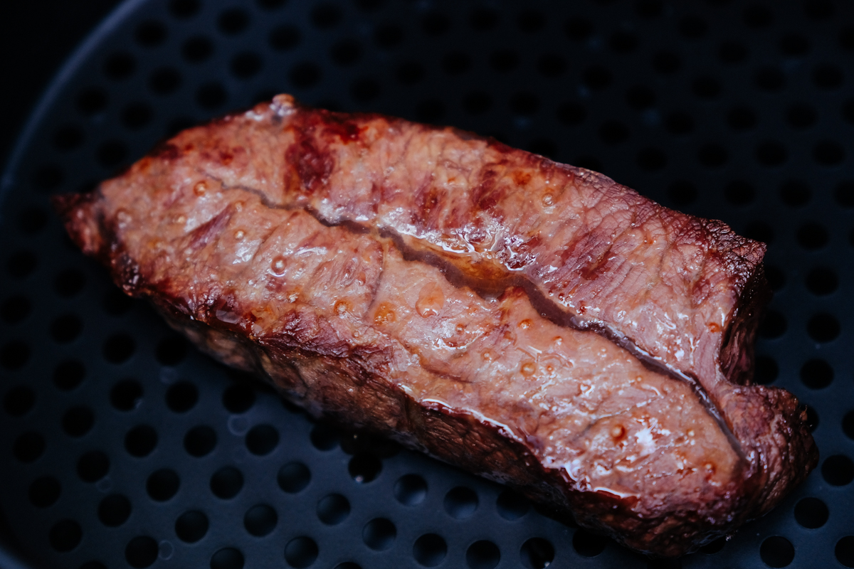 預設的 12 分鐘以這厚度來說(約 3 公分厚),剛好是 5 分熟左右,而且吃起來還是保留了很多肉汁,看照片就知道,現在想吃牛排只要 12 分鐘就上桌了,不用再舒肥等半天。