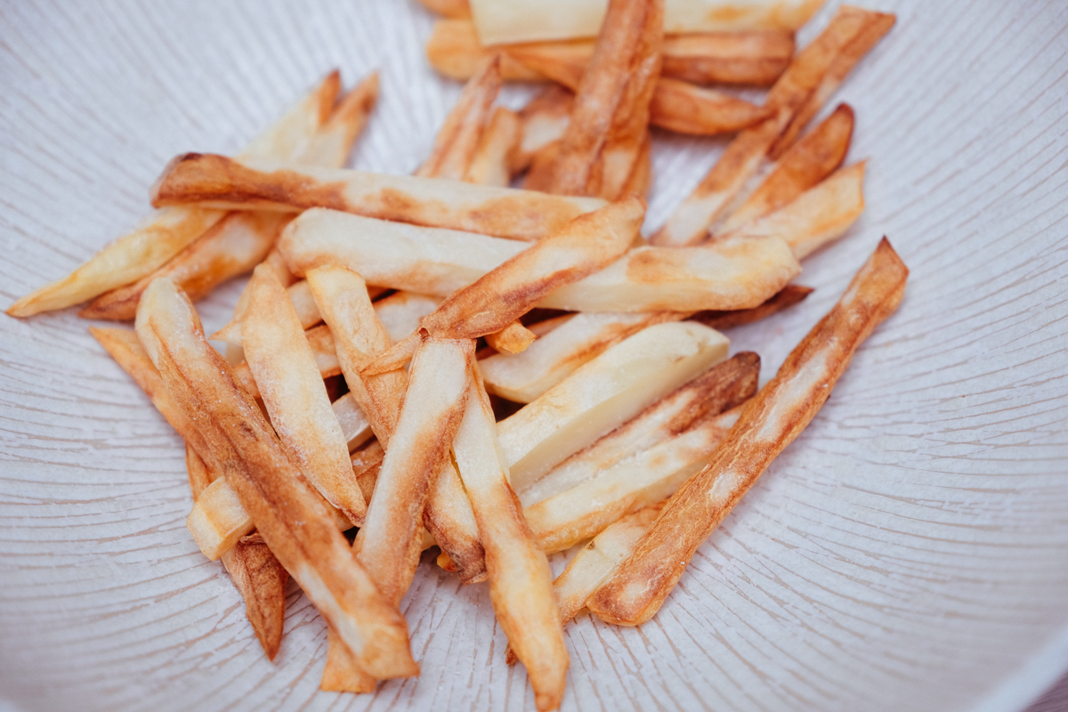 炸薯條,也是內建的模式,既然是炸,當然還是需要一點油,先將薯條切成條狀(建議每根寬度不超過 0.8 公分,請大約抓),加入一匙油(我用苦茶油還頗香)跟半匙到一匙的鹽巴均勻的拌一拌,就可以丟進去,如果你的薯條量比較多,可以看烘烤時間多長,將他切分為三等分時間,中間可以拉出鍋子來翻一下薯條,2~3 次,這樣就會很完美了,比麥當勞好吃!