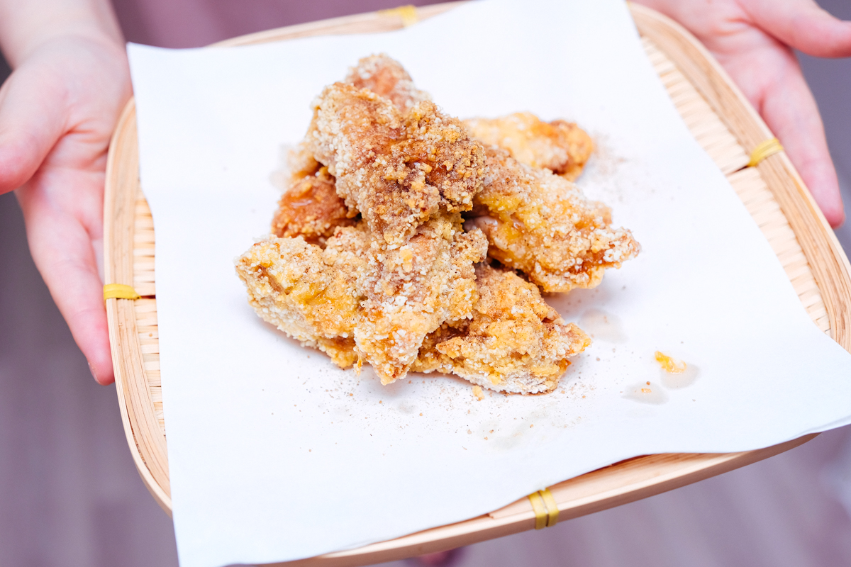 - 食材:雞腿切塊去骨 200 克 |炸物裹粉:蛋兩顆、木薯粉(地瓜粉)|油:苦茶油|醃料:五香粉、蔥白切段、蒜泥、白胡椒、醬油、米酒、糖,醃製時間 12 小時。