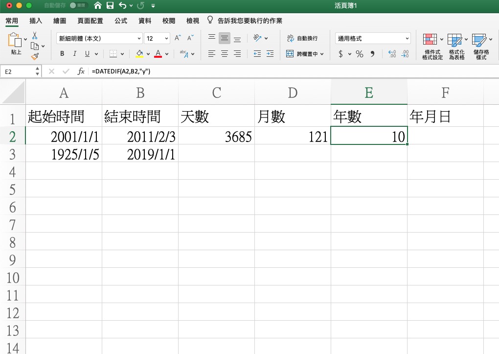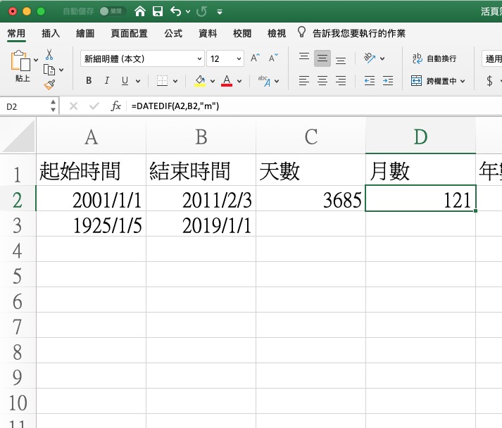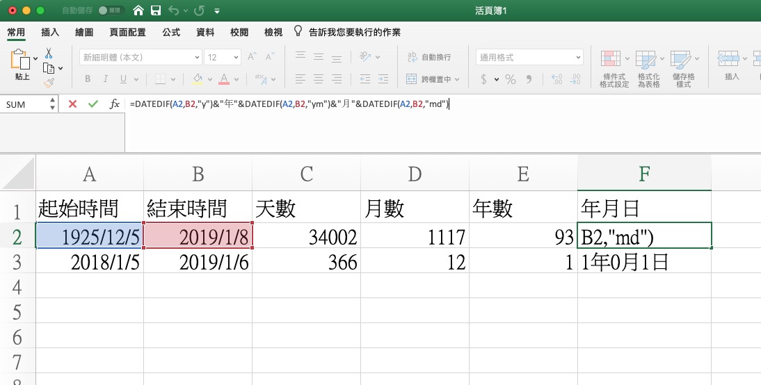 這裡,但應該一看也知道,就是計算 B2 跟 A2 欄位的日期差異,後面的 d 就是代表計算日期(天)。