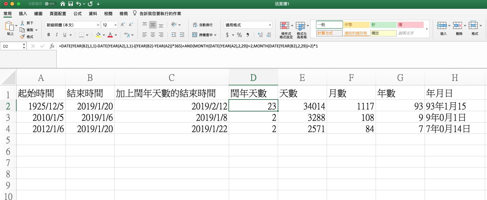 在中間再插入二欄,我們可以預先在結束時間加上閏年天數的結束時間,閏年天數的算法有點複雜,大家看看就好: