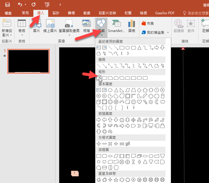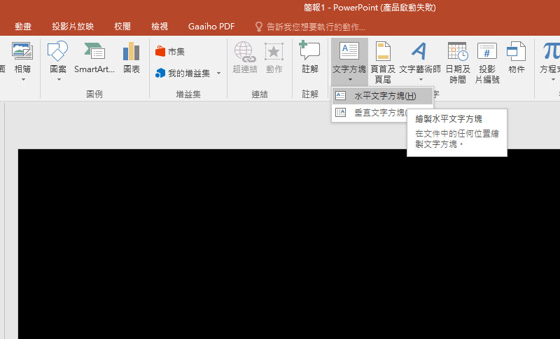 首先我們可以先建立一張黑底的簡報,然後插入一個「文字方塊」。