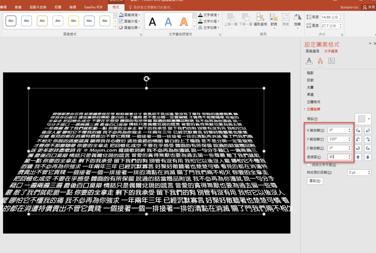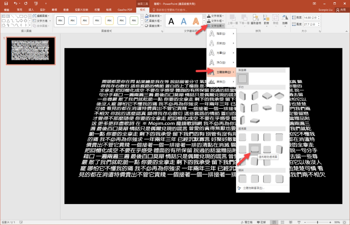 按一下文字方塊後,上方會出現格式,在裡面找到「文字效果 > 立體旋轉 > 擇擇溫和鬆弛透視圖」,這時會看到文字就這樣傾斜,一個基本的樣子就出來了。