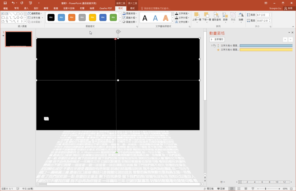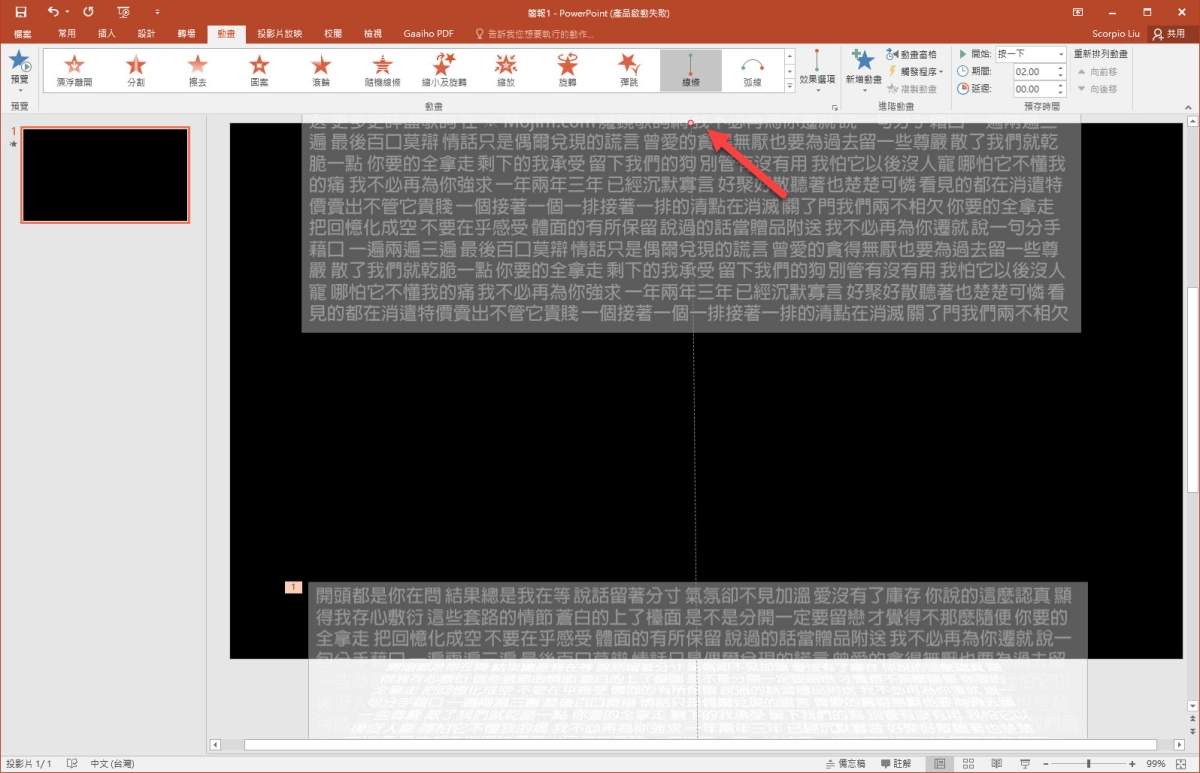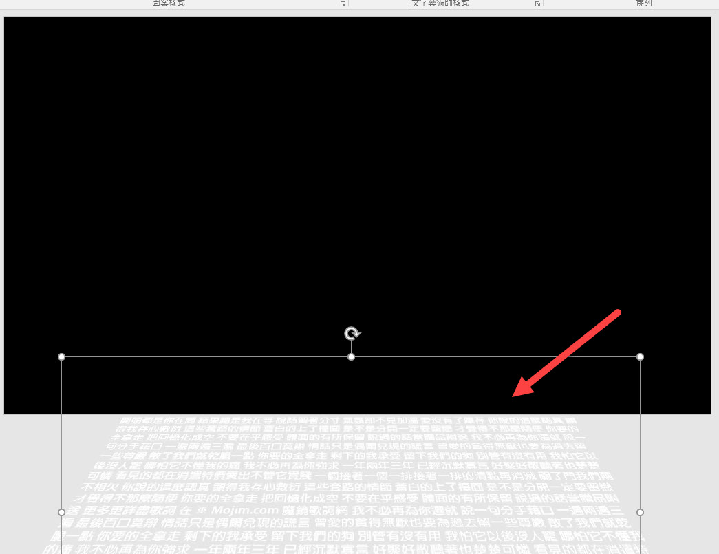然後將文字方塊往簡報下方拉,讓文字的第一排剛好在簡報範圍的下方。